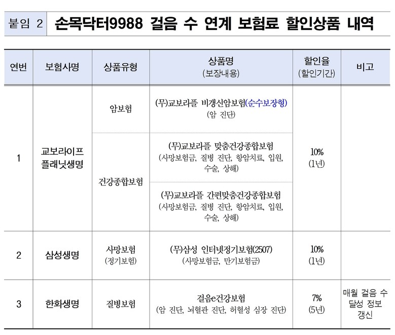 둘째, 손목닥터9988 참여자가 월 20일 이상 걷기 목표(일 8,000보·70세 이상 5,000보)를 달성하면, 보험 가입시 보험료 5~10%를 12~60개월간 할인해주는 혜택도 추가된다.