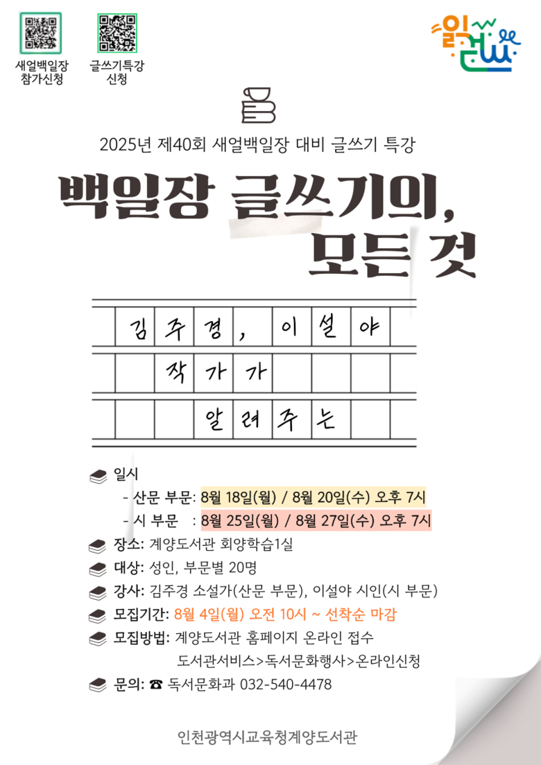 계양도서관은 8월 18일부터 27일까지 ‘백일장 글쓰기의 모든 것’ 특강을 운영한다. 산문과 시 부문으로 나뉘어 진행되며, 산문 부문은 8월 18일·20일에 김주경 소설가가, 시 부문은 8월 25일·27일에 이설야 시인이 강연한다. 강의는 오후 7시부터 9시까지 각 2회씩 열린다.