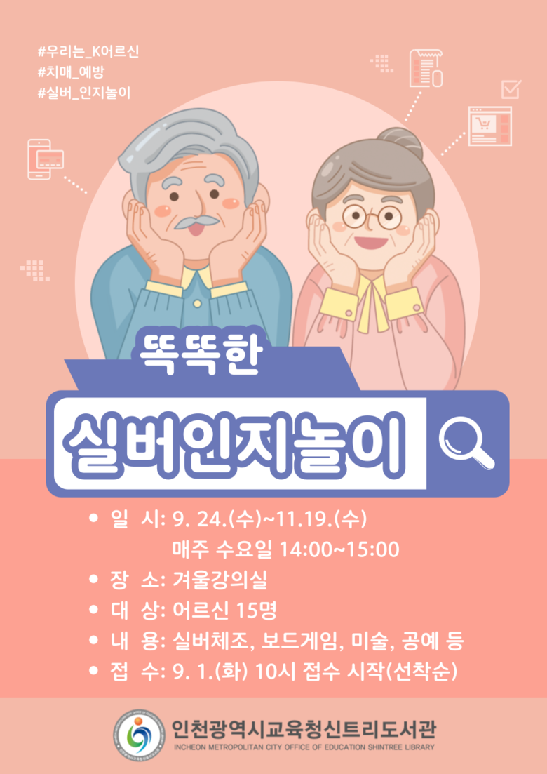 참가 신청은 9월 1일 오전 10시부터 신트리도서관 누리집(https://lib.ice.go.kr/shintree/index.do)에서 선착순 가능하며, 자세한 내용은 신트리도서관 누리집을 확인하거나 마을교육지원과(☎032-363-5045)로 문의하면 된다.