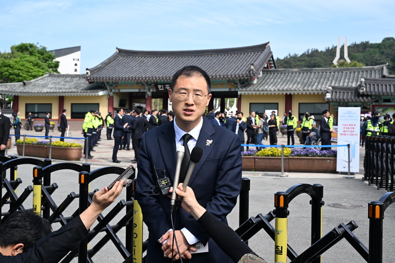 무소속 김상욱 국회의원이 18일 광주 북구 운정동 국립 5·18 민주묘지 민주의문 앞에서 더불어민주당 입당 기자회견을 하고 있다. 2025.5.18 [공동취재]
