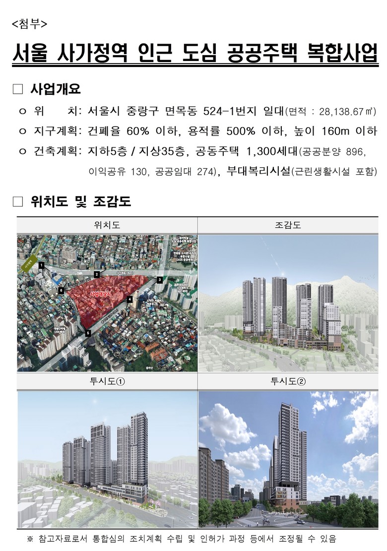 최진석 서울시 주택실장은 “사가정역 인근 도심 공공주택 복합사업이 차질 없이 추진될 수 있도록 지원하겠다.”며 “면목동 일대의 주택공급 확대와 함께 도시환경 정비를 통해 주거환경 개선과 지역사회 활성화가 기대된다.”라고 말했다.