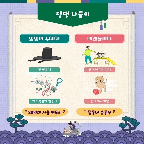 반려가족을 위한 ‘댕댕나들이 in 드라마촬영장’도 운영된다. 드라마촬영장 명소 6곳을 잇는 스탬프투어, 반려견 갓·비즈 목걸이 만들기, 전통 소품 포토존이 마련돼 보호자와 반려견이 함께 즐길 수 있다. 애견놀이터에는 놀이기구와 어질리티 체험장이 설치돼 반려견이 마음껏 뛰어놀 수 있고, 보호자를 위한 휴게 공간도 함께 제공된다.