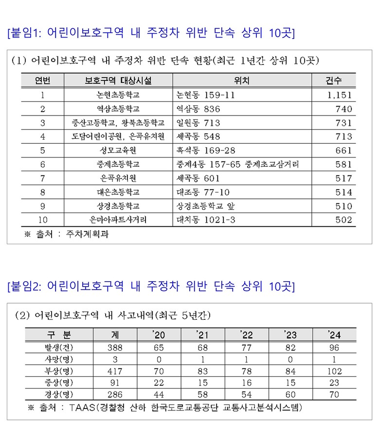 국민의힘 윤영희 서울시의원이 서울시로부터 제출받은 자료를 분석한 결과, 최근 1년간 어린이보호구역 내 주정차 위반 단속 상위 10곳 중 다수가 강남구 소재 초등학교 및 학원가 인근 구간으로 확인됐다. [붙임1]
