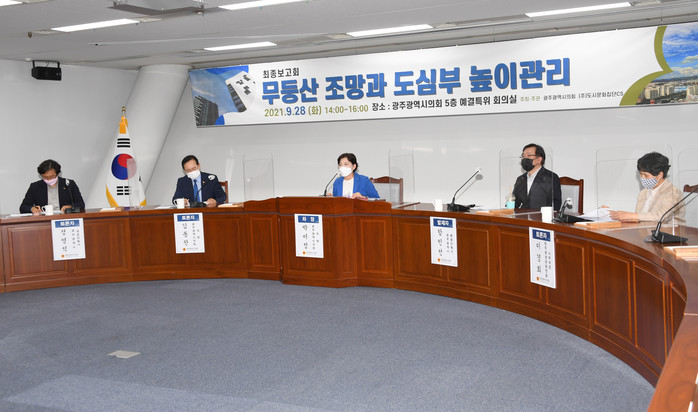 좌장을 맡은 박미정 의원은 “무등산 조망은 단순히 무등산이라는 실체 하나를 이야기 하는 것이 아니라, 우리 원도심이 가지고 있는 역사와 이야기, 우리 시민들의 삶을 포괄적으로 은유하는 의미로서, 오늘의 토론을 통해 광주다운 도시경관을 디자인하기 위한 높이 관리 방안에 대해 새로운 방향을 모색하는 계기가 되기를 바란다.”고 말했다.