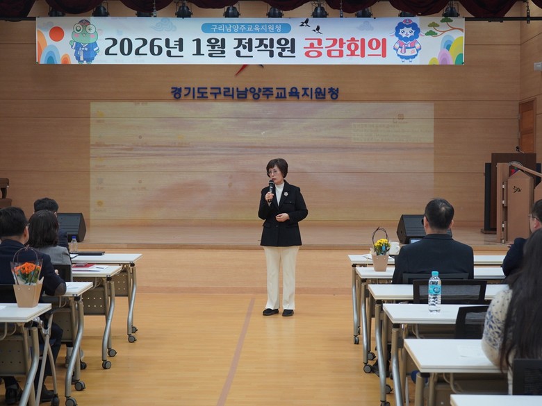 [남양주시 세계타임즈=송민수 기자] 경기도구리남양주교육지원청(교육장 서은경)은 2일(금) 2026년도 첫 공감회의를 개최했다. 300여 명의 전직원이 참석한 이번 공감회의는 2026 구리남양주교육의 비전, 목표, 정책, 4대 핵심과제를 발표하고, 각 부서별 사업을 함께 공유하는 시간을 가졌다.