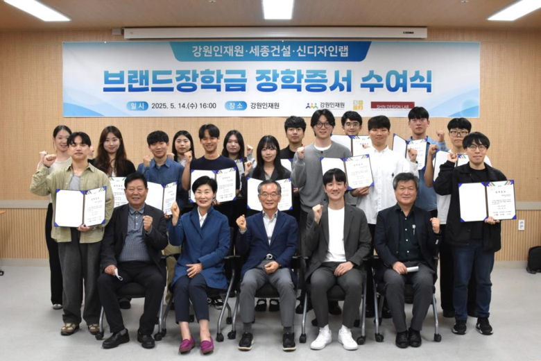 [강원도 세계타임즈=김민석 기자] 강원인재원(원장 김학철)은 5월 14일(수) 오후 4시, 강원인재원 2층 대회의실에서 2025년 강원·세종건설·신디자인랩 「브랜드장학금」 수여식을 개최하고, 올해 선발된 장학생 16명에게 장학증서를 전달했다.