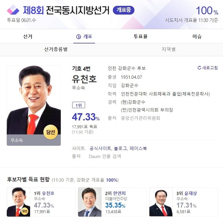 [세계타임즈 백진욱 기자] 무소속 유천호 후보가 제 8회 전국동시지방선거 인천 강화군수으로 당선됐다.