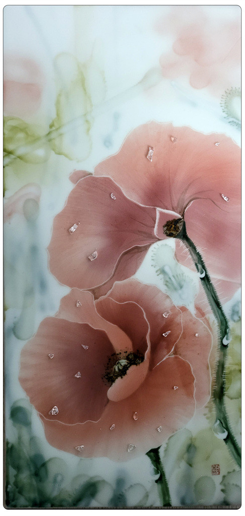작품명 '연에 맺힌 이슬'은 무더운 여름 더위를 씻겨주며 아름다운 자태를 뽐내듯 피어 있는 연꽃의 매력을 부각시켜 연꽃에서 강한 에너지가 생성되도록 했다. '위안' 작품은 예쁜 양귀비 꽃으로 잠깐이라도 미소를 지을 수 있는 평화로움을 그리고 싶었다. 양귀비 꽃말 위안처럼 따뜻한 속삭임이 느껴지도록 했고, 꽃잎 위에 물방울은 유리를 사용하여 이색적인 표현으로 작품을 완성 하였다. 또한 '연과 물방울' 작품은 이제 막 연잎이 피어나는 어린 잎 위에 물방울이 송골송골 맺힌 표현으로 맑고 깨끗함을 강조해 상쾌한 기분으로 그림을 즐기도록 했다.