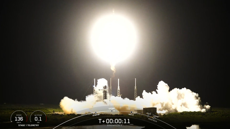 우리 군의 정찰위성 4호기를 탑재한 미국 우주기업 스페이스Ⅹ의 발사체 '팰컨9'이 한국시간 22일 오전 9시 48분(현지시간 21일 오후 8시 48분) 미국 플로리다주 케이프커내버럴 우주군 기지에서 발사되고 있다. 2025.4.22 [SpaceX 제공 영상]