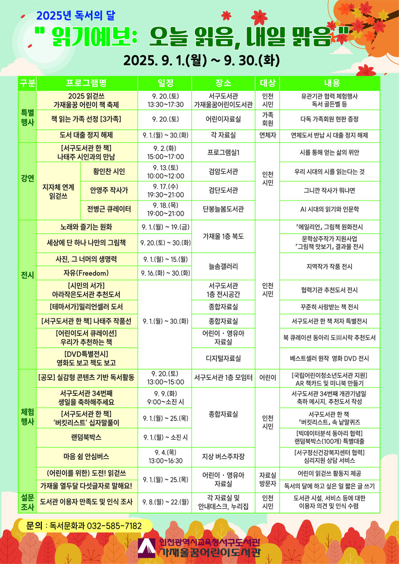 주요 행사로는 ▲ 나태주 시인과의 만남(9월 2일 화요일 오후 3시, 프로그램실1) ▲ 2025 읽걷쓰 가재울꿈 어린이 책 축제(9월 20일 토요일 오후 1시 30분, 도서관 앞마당 등) ▲ 지자체 연계 읽걷쓰 수요인문학(9월 중, 서구구립도서관 3개소) 등을 마련했다.