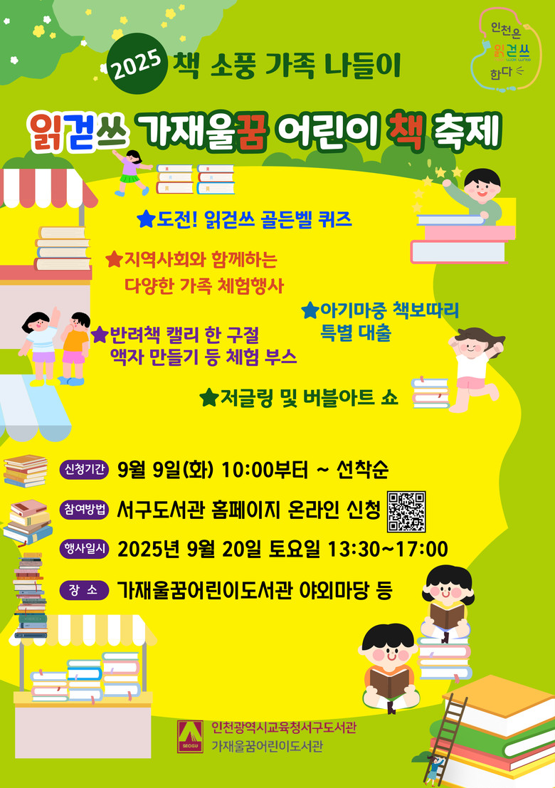 일부 프로그램은 9월 9일(화) 오전 10시부터 서구도서관 누리집에서 온라인 사전 신청이 가능하며, 자세한 사항은 서구도서관 누리집(https://lib.ice.go.kr/seogu) 또는 독서문화과 어린이자료실(☎ 032-585-7172~3)로 문의하면 된다.