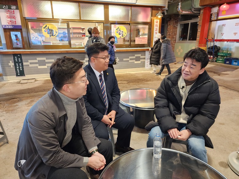 [충북 세계타임즈=이현진 기자] 충북도의회(의장 황영호) 행정문화위원회 최정훈(청주2) 의원과 이태훈(괴산) 의원은 15일(일) 오전 충북 구도심과 전통시장 활성화를 위해 충남 예산을 찾아가 더본코리아 백종원 대표를 만났다.