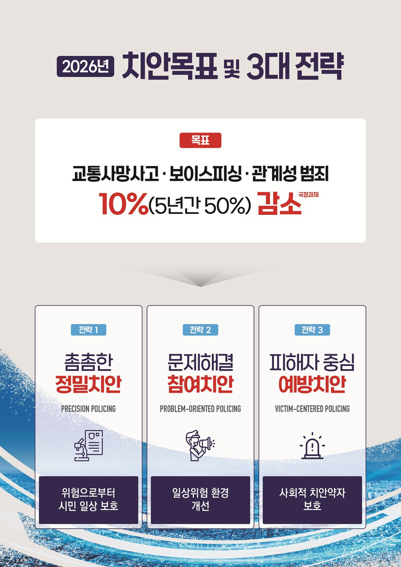 ▸ 시민과 함께 ‘집 앞부터 안심되는 대구’ 만들기에 매진 [대구 세계타임즈=한윤석 기자] 대구자치경찰위원회(위원장 이중구)는 2026년을 ‘시민과 함께 만드는 일상안전의 해’로 정하고, 교통안전·인파·범죄예방·치안약자 보호·치안역량 강화 등 5대 정책 분야 및 15개 세부 과제를 추진해 나갈 계획이다.