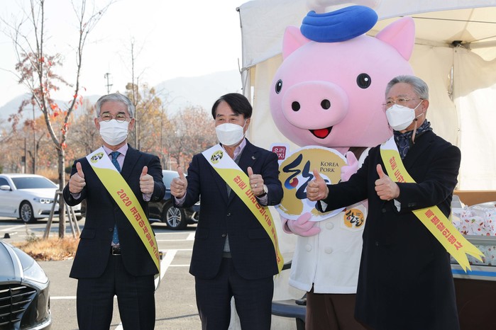 지난 12일 경마공원 드라이브스루 특별 행사장에서 한국마사회 김낙순 회장은 하태식 대한한돈협회장 · 임영호 농축산연합회장과 함께 코세페 홍보와 경제위기 극복을 응원하기 위한 ‘엄지척 챌린지’에 참여했다.