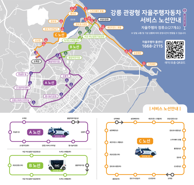 새롭게 추가되는 노선은 강릉역-버스터미널-오죽헌-올림픽뮤지엄을 순환하는 노선으로 KTX나 시외, 고속버스를 타고 강릉시를 방문하는 관광객들이 바로 자율주행차를 탑승할 수 있도록 운행된다.