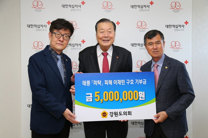 [강원도=세계타임즈 김민석 기자] 강원도의회(의장 한금석)는 10월 30일 (수) 11시에 태풍 「미탁」으로 피해를 입은 이재민들을 위한 기부금 500만원을 대한적십자사 강원도지사회장(이돈섭)에게 전달하였다.