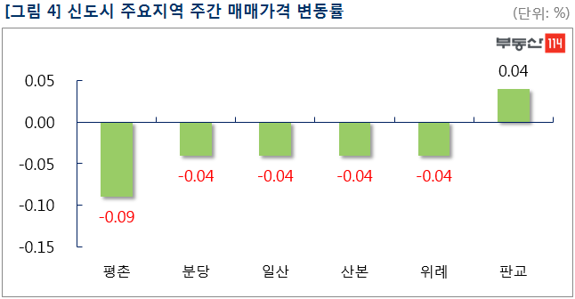 신도시는 ▼평촌(-0.09%) ▼분당(-0.04%) ▼일산(-0.04%) ▼산본(-0.04%) ▼위례(-0.04%) 등의 순으로 비교적 고른 하락률을 나타냈다. 평촌은 급매물도 거래가 이뤄지지 않으면서 평촌동 꿈라이프, 초원LG 등이 500만원-1,000만원 떨어졌다. 분당은 야탑동 장미현대가 500만원-2,000만원 떨어졌고 서현동 시범한양도 1,000만원 하락했다.