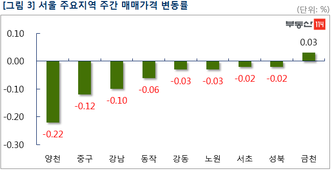 [세계타임즈 심귀영 기자] 서울 아파트 매매가격 주간 변동률이 최근 한 달 간 -0.03% 내지 -0.04% 수준을 맴돌며 21주째 마이너스 기조를 이어갔다. 재건축 아파트 중심의 하락세가 이어지고 있는데, 강남권 재건축 시장은 저가 급매물 소진 후 추격 매수 없이 관망세를 보이는 분위기다. 금주에는 특히 강남구 압구정동 일대 재건축 단지의 하락세가 눈에 띄었다. 거래 부진이 길어지면서 호가가 하향 조정된 것이다.