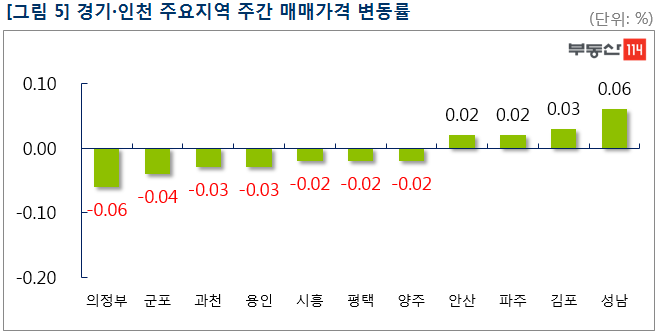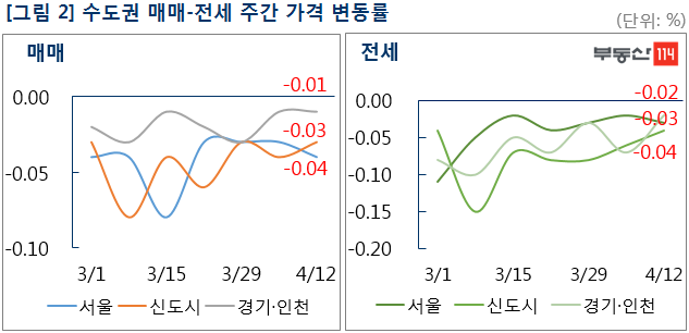 부동산114(www.r114.com)에 따르면 금주 아파트 매매가격 변동률은 서울 -0.04%, 신도시 -0.03%, 경기·인천 -0.01%로 대체로 한 주전과 비슷한 하락세를 나타냈다. 다만, 서울 재건축 아파트는 한주간 0.10% 내려 한 주전(-0.02%)보다 낙폭이 커졌다. 전세시장은 서울이 0.03% 떨어졌다. 신도시와 경기·인천은 각각 -0.04%, -0.02%의 변동률을 기록해 전 주에 비해 하락폭이 축소됐다.
