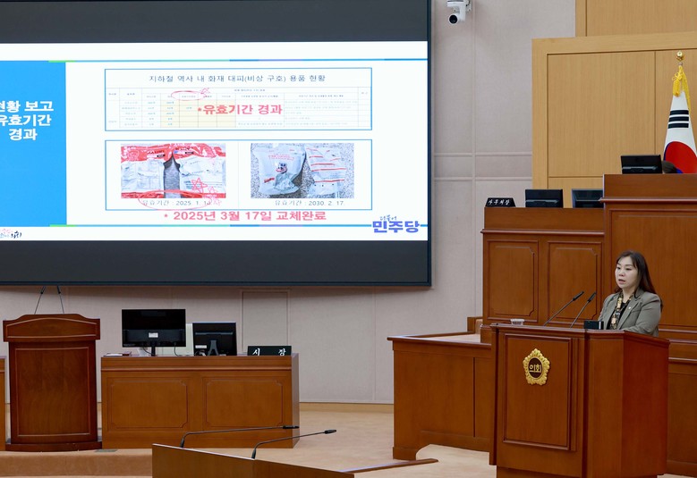 특히 “다수의 물품이 사용기한이 경과했음에도 교체되지 않고 그대로 사용되고 있는 것으로 확인됐다”며, “이러한 관리 부실은 단순한 행정적 부주의가 아닌 시민의 생명을 위협하는 안전불감증의 한 단면”이라고 강조하고, 2003년 대구 지하철 참사의 교훈을 언급했다.