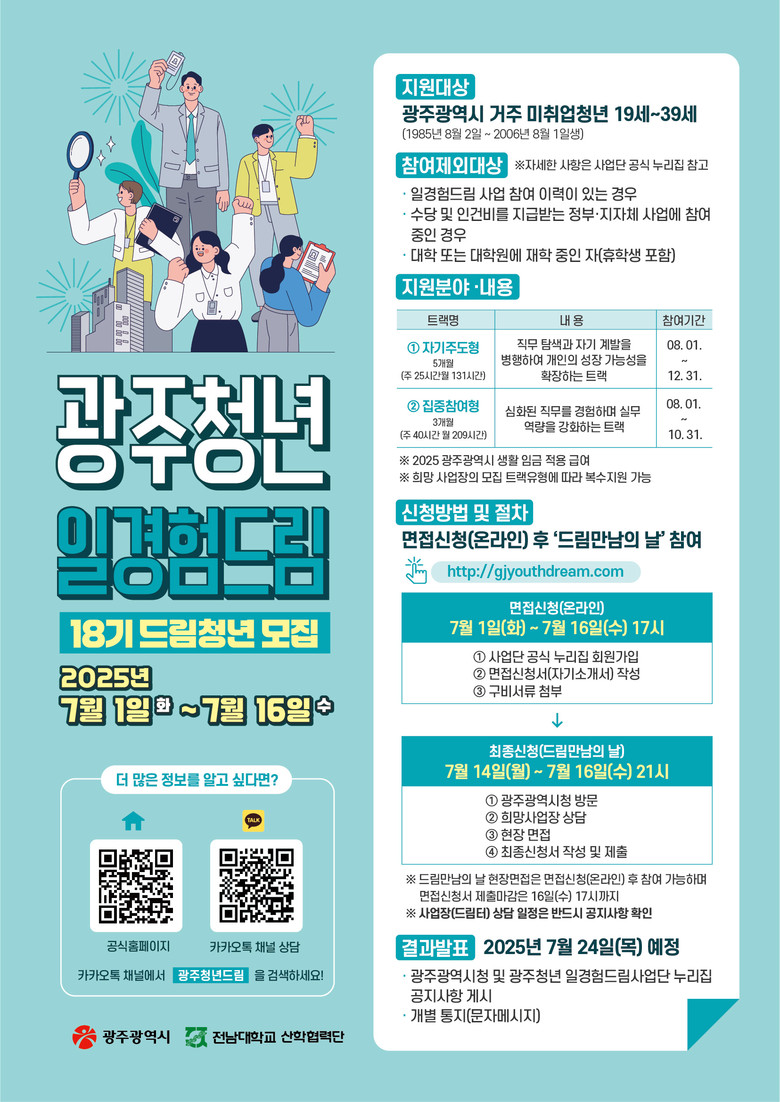 문의는 카카오톡채널 ‘광주청년드림’과 광주청년 일경험드림 사업단으로 하면 된다.
