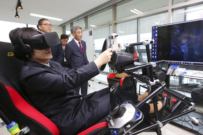 | ▲ 21일 서울 금천구 가산동 ‘매크로그래프’ 본사에서 권선주 기업은행장(왼쪽)이 가상현실(VR) 체험을 하고 있다. (맨오른쪽은 신성호 IBK투자증권 대표이사) <사진제공=기업은행> |