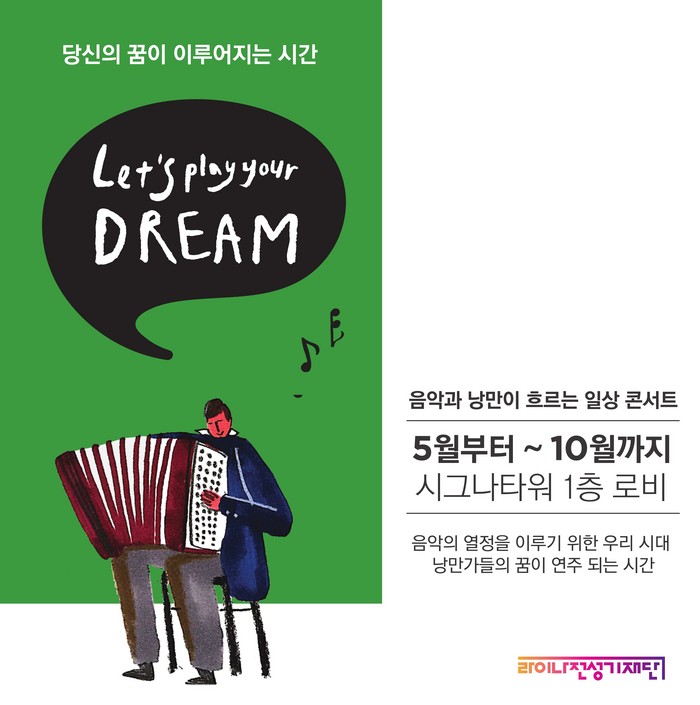 이와 관련 재단 홍봉성 이사장은 “꿈을 간직한 50+세대와 아마추어 음악가들이 이번 기회를 통해 열정을 마음껏 펼치기를 바란다”며 “라이나생명이 제공하는 로비 공연이 인근 직장인과 시민들에게 일상 속 작은 휴식이 되었으면 좋겠다”고 말했다.