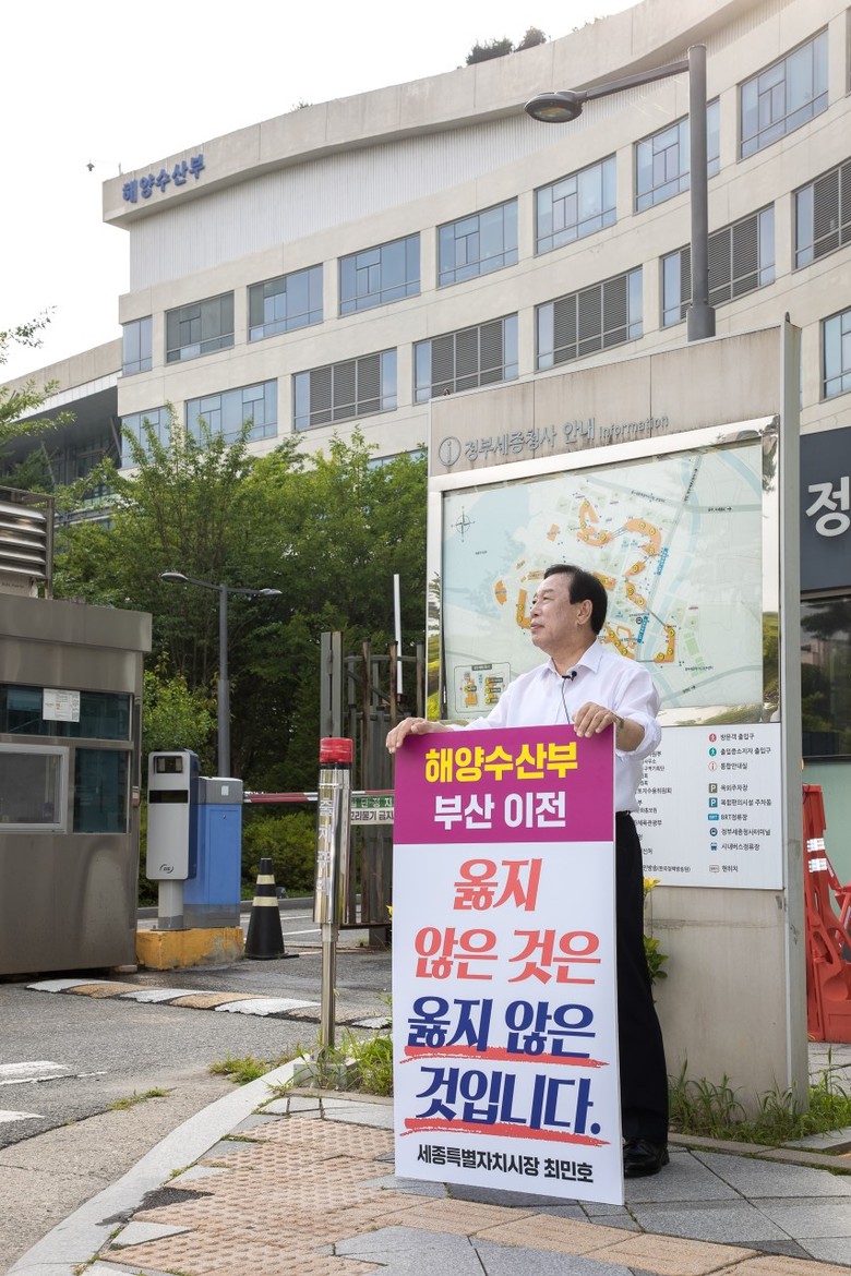 [세종 세계타임즈=이채봉 기자] 최민호 세종시장이 4일 정부세종청사 해양수산부 입구에서 '해수부 부산 이전 반대' 1인 시위를 전개하고 있다. 최민호 시장의 1인 시위에는 지난 3일에 이어 해수부 이전 반대의 뜻을 함께하는 시민 100여 명이 자리를 함께 했다.