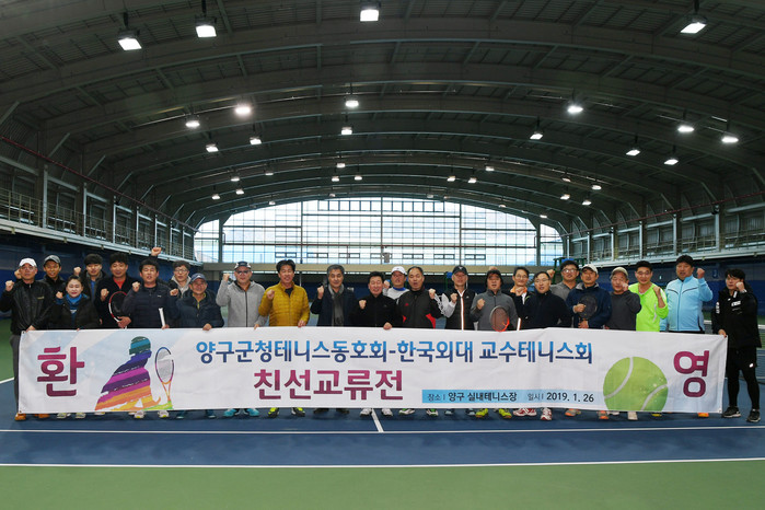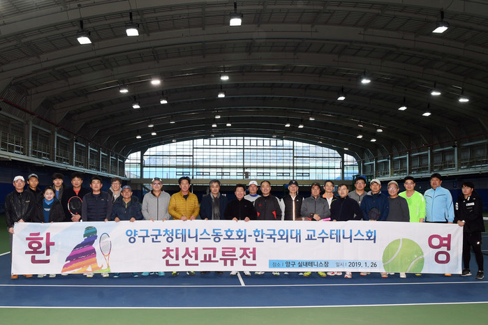 [양구군=세계타임즈 김민석 기자] 양구군청테니스동호회와 한국외대교수테니스회와의 친선 테니스교류전이 26일 양구실내테니스장에서 열렸다. 교류전에는 조인묵 양구군수, 이상건 양구군의회의장, 최종찬 한국외대용인캠퍼스부총장, 양구군청 동호회원, 한국외대교슈테니스회원 등 40여명이 참가했다.