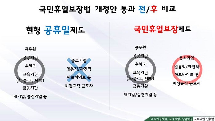 국회 과학기술정보방송통신위원회 소속 신용현 의원(국민의당)이 공무원, 공공기관, 대기업만 쉬는 현행 공휴일제도를 ‘국민휴식보장제도’로 전환해, 모든 국민에게 최대 18일의 국민휴일을 법률로 보장하는 ‘국민의 휴일에 관한 법률안’을 26일 대표발의 했다.