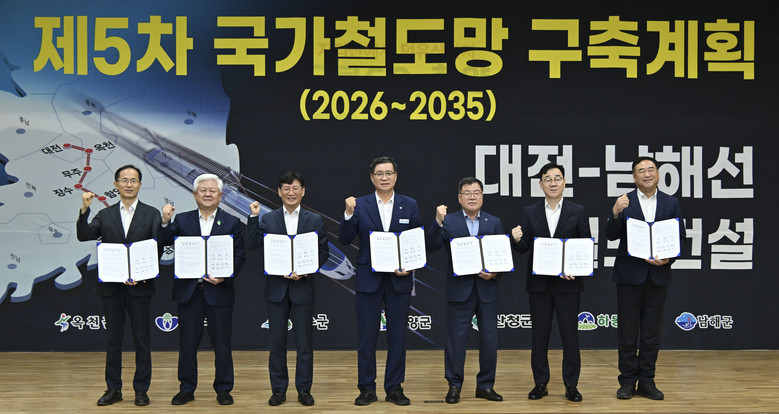 이날 경과보고와 협약서 서명, 공동건의문 채택, 상징퍼포먼스, 기념촬영 등의 순으로 진행된 협약은 ‘대전~남해선 철도건설 사업’의 원활한 추진과 정부의 제5차 국가철도망 구축계획 반영을 위해 추진됐다.