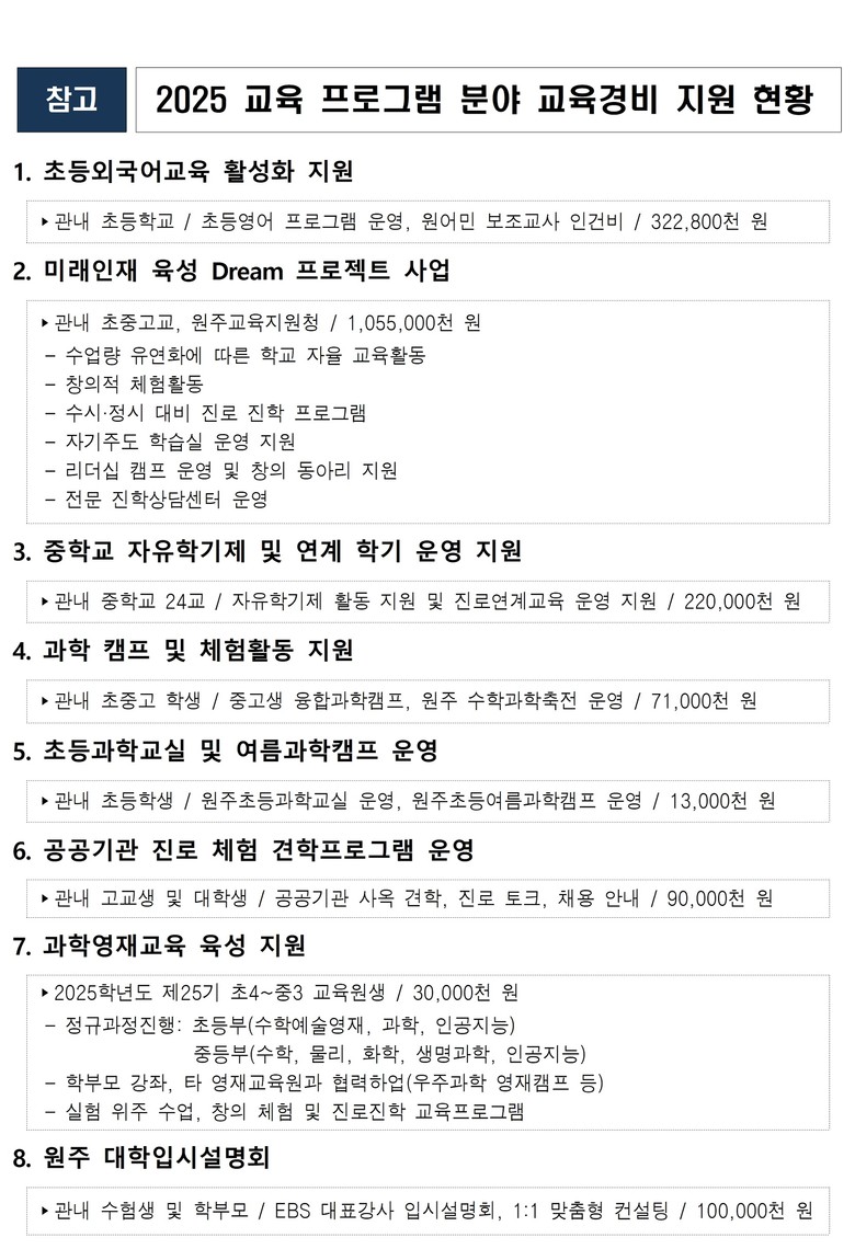 시 관계자는 “교육경비 지원은 원주의 미래를 책임질 인재 육성을 위한 가장 가치 있는 투자”라며, “앞으로도 꾸준한 교육경비 지원을 통해 공교육의 기능을 강화하고 학생들이 가진 무한한 역량을 펼칠 수 있도록 최선을 다하겠다.”라고 말했다.