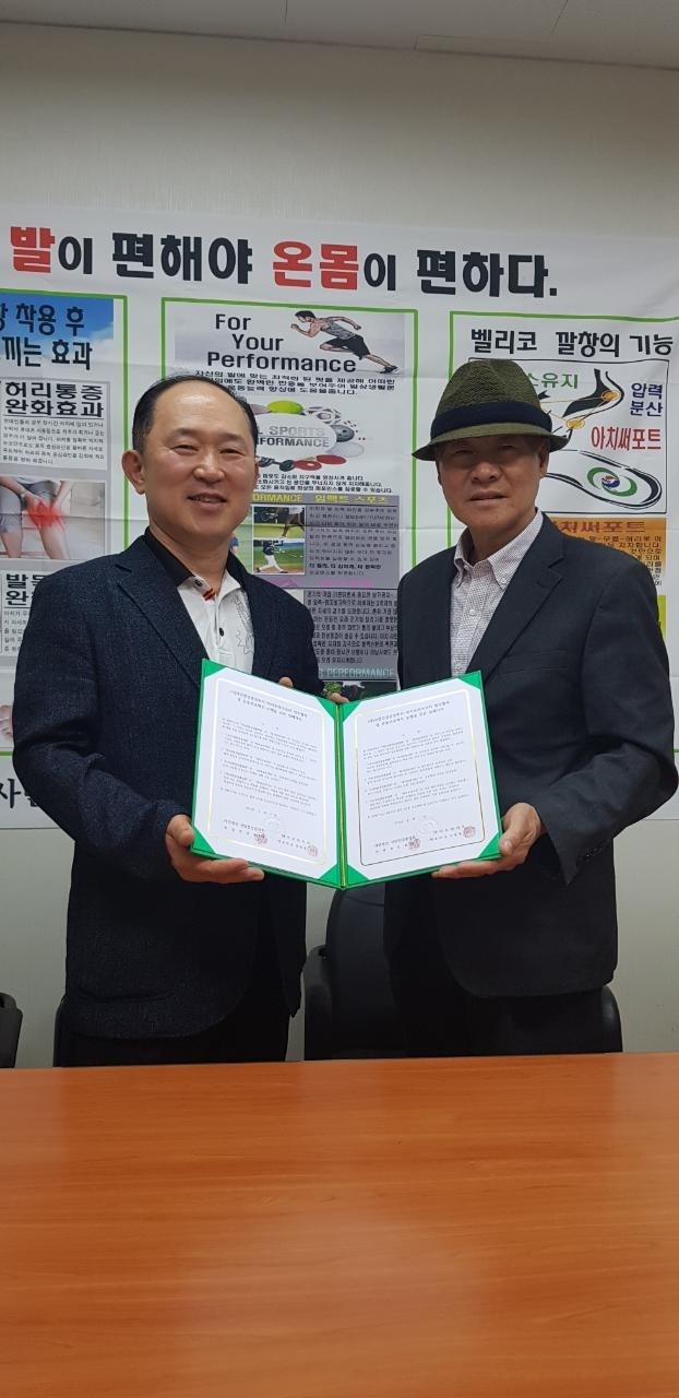 | ▲ (사)국민건강중앙회 권진철 회장(사진 오른쪽)과 바이오라이프 지병욱 사장이 MOU체결 후 포즈를 취하고 있다. |