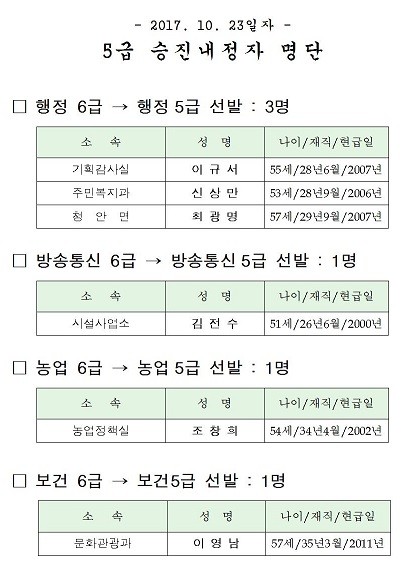■ 5급 승진내정자 명단 △2017. 10. 23일자