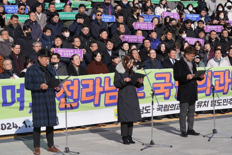 범추위 허정 공동위원장은 대회사에서“영하 10도의 매서운 날씨에도 이렇게 많은 전남도민과 향우가 모인 것은 도내 의대 유치를 바라는 뜨거운 열망과 염원을 보여주는 것”이라면서, “국민의 기본권인 생명권과 건강권을 보장받기 위한 전남도민의 간절한 외침에 의료계와 정부가 이제는 전라남도 국립의대 신설로 화답해 주길 바란다.”라고 강조했다.
