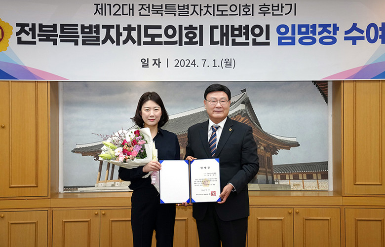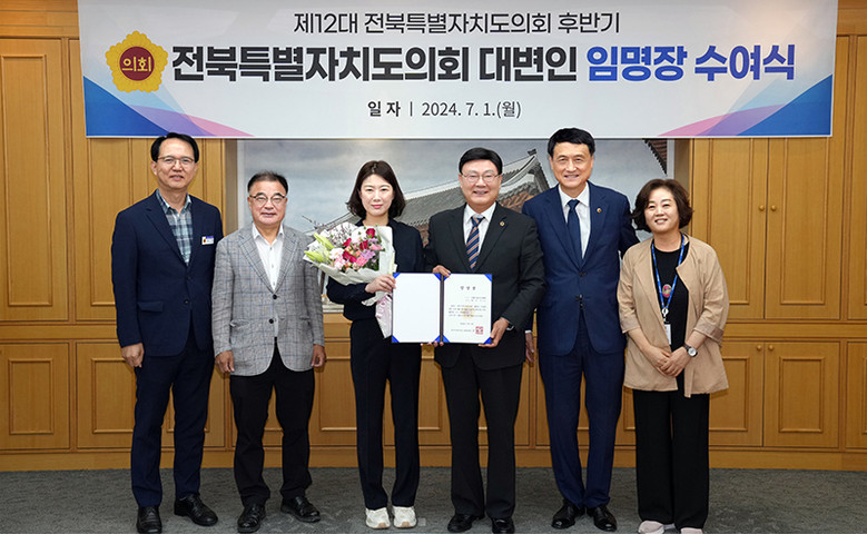 문승우 의장은 이날 오전 의장실에서 열린 임명장 수여식에서 “의회 대변인은 도민과 의회를 잇는 중요한 자리”라며 “도민께 도의회 활동을 제대로 알리고, 의회 입장을 도민과 언론에 바르게 전달하는 등 의회 위상을 높이고 신뢰를 더하는 가교가 되어달라”고 당부했다.