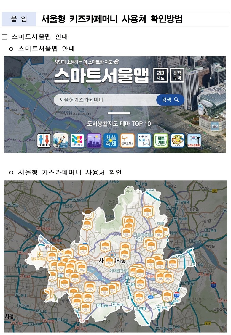 ‘서울형 키즈카페머니’ 상품권 이용이 가능한 민간 키즈카페는 서울시 도시생활지도인 ‘스마트서울맵(map.seoul.go.kr)’에서 위치와 주소를 확인할 수 있고, 서울페이플러스 앱 내 가맹점 목록에서도 확인 가능하다.