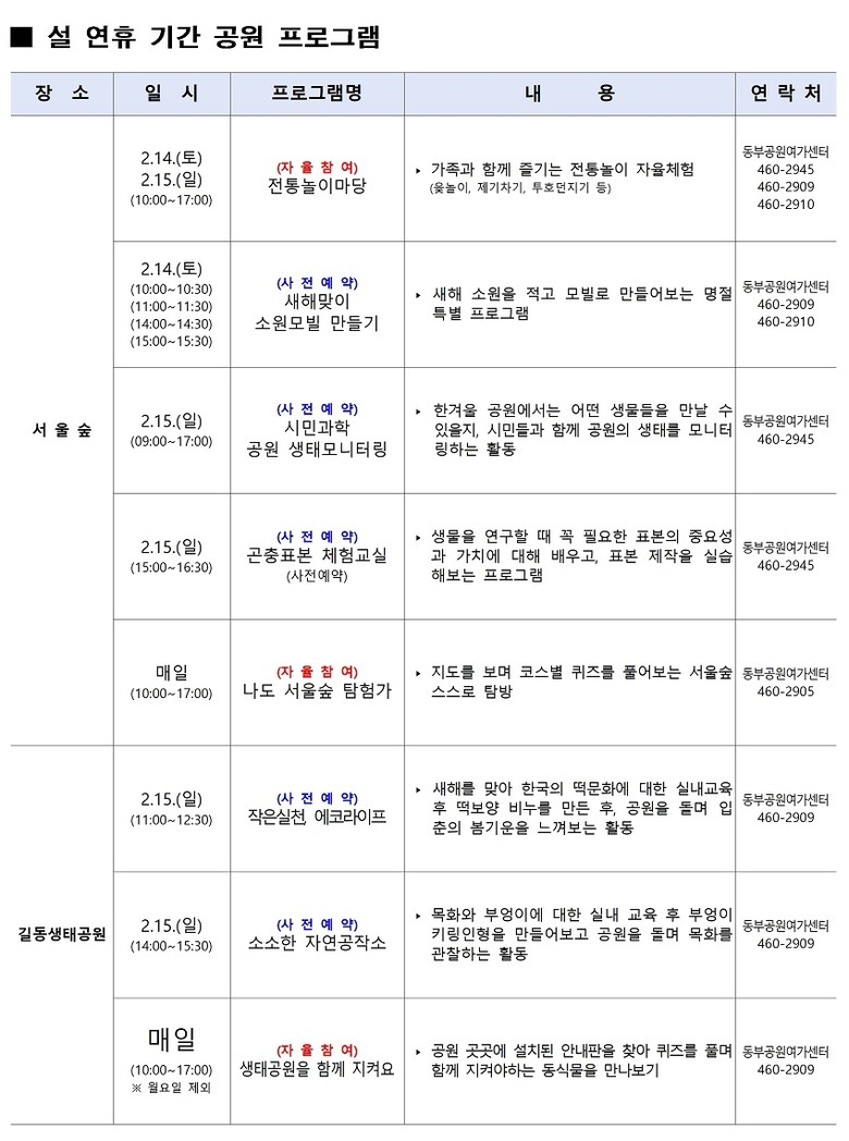 6개 공원에서도 연휴 내내 온 가족이 함께 즐길 수 있는 ‘설맞이 공원 프로그램’이 운영된다.