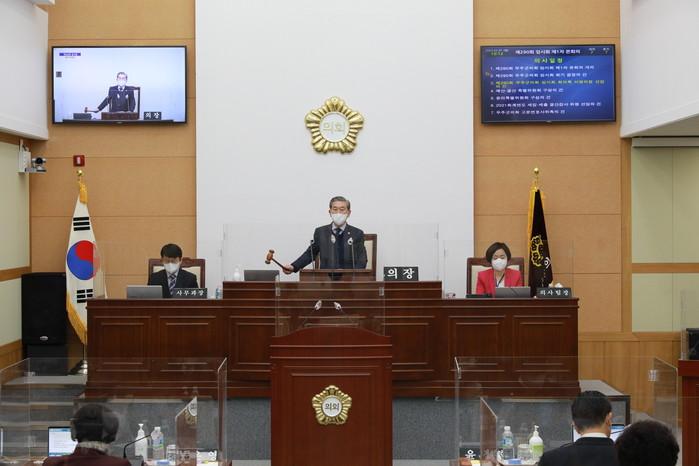 박찬주 의장은 개회사를 통해 “오미크론의 급속한 확산세로 다수의 확진자가 발생하는 힘든 시기에 첫 회기를 시작하는 마음이 어느 때보다 무겁다”고 말했다.