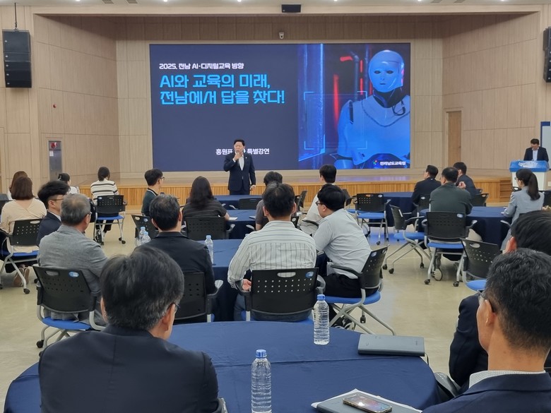 [전남 세계타임즈=우덕현 기자] 김정희 전라남도의회 교육위원장은 9월 19일(금), 전남교육청이 개최한 「2025 전남 AI‧디지털 교육 방향 특별강연」에서 축사를 통해 미래 교육의 방향성을 제시했다. 이번 강연에는 SK쉴더스 홍원표 고문이 연사로 나서 인공지능과 디지털 전환이 불러올 교육 혁신 과제를 함께 논의했다.