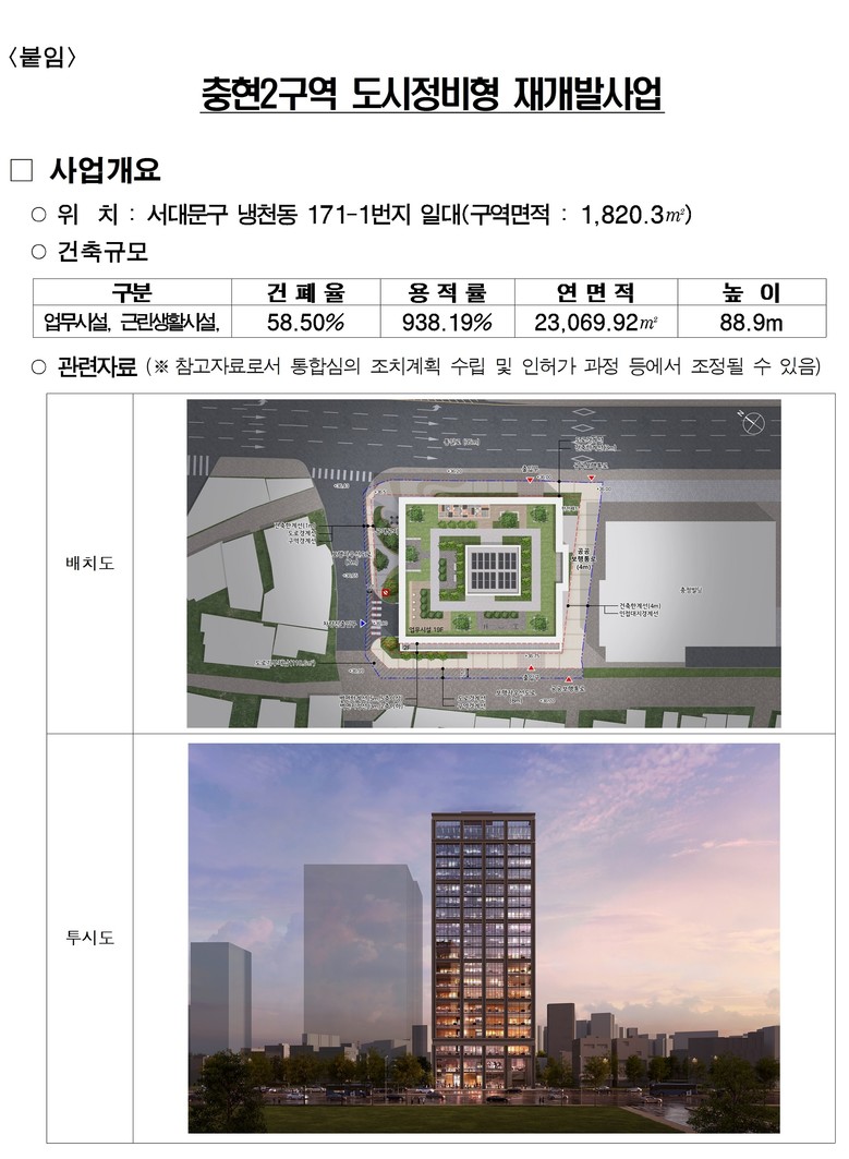 통합심의(안)은 정비계획에 따라 지하8층, 지상19층 규모의 업무시설, 근린생활시설을 복합개발하여 냉천동 일대 도심업무기능을 강화하고 경제 활력을 불어 넣을 수 있을 것으로 보인다.
