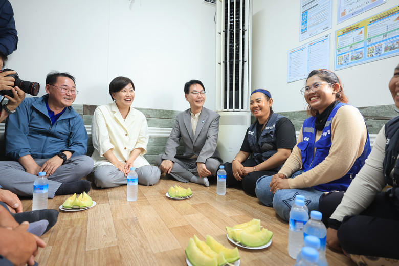 | ▲ 송미령 농림축산식품부 장관과 심덕섭 고창군수가 외국인계절근로자 쉼터를 방문해 이야기를 나누고 있다 |