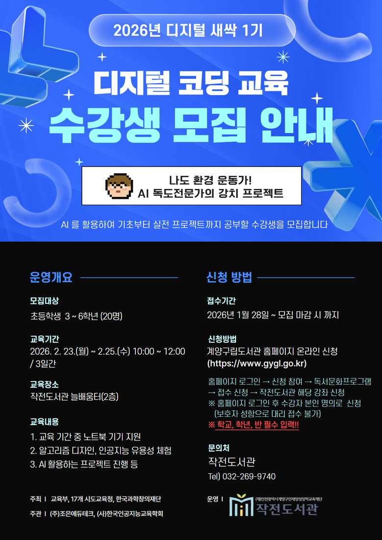 - 인공지능(AI)·알고리즘 기반 체험형 프로그램 구성 - [계양구 세계타임즈=심하린 기자] 인천 계양구 작전도서관(관장 한양진)은 겨울방학을 맞아 디지털 코딩 교육 프로그램 <디지털 새싹 1기>를 운영한다고 밝혔다.