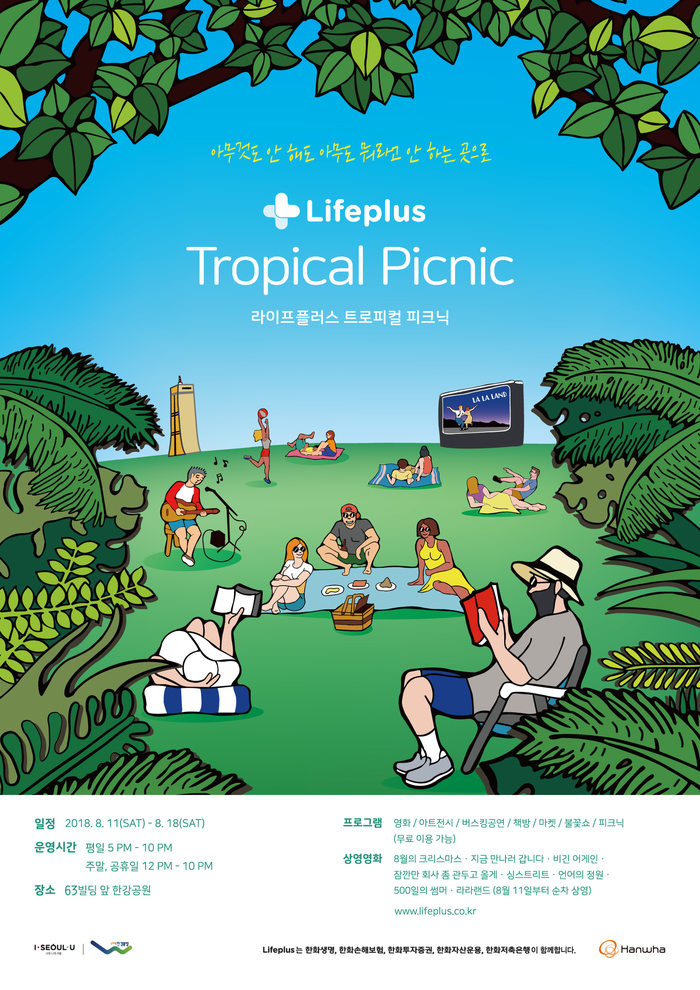 「Lifeplus 트로피컬 피크닉」은 한화생명이 처음 선보이는 여름 축제로 무더위 속 일상에 지친 시민들에게 도심 속 힐링의 공간을 선사한다. '아무것도 안 해도 아무도 뭐라고 안 하는 곳으로'라는 슬로건으로 진행되는 이번 축제는 영화 상영, 어쿠스틱 버스킹 공연, 아트 작품 전시, 북 피크닉, 불꽃쇼 등 휴식을 취하며 편하게 즐길 수 있는 다양한 프로그램으로 구성돼 시민들에게 무료로 개방된다. 평일 오후 5시, 주말과 공휴일 낮 12시부터 운영되며 자세한 내용은 라이프플러스 트로피컬 피크닉 홈페이지에서 확인 할 수 있다.