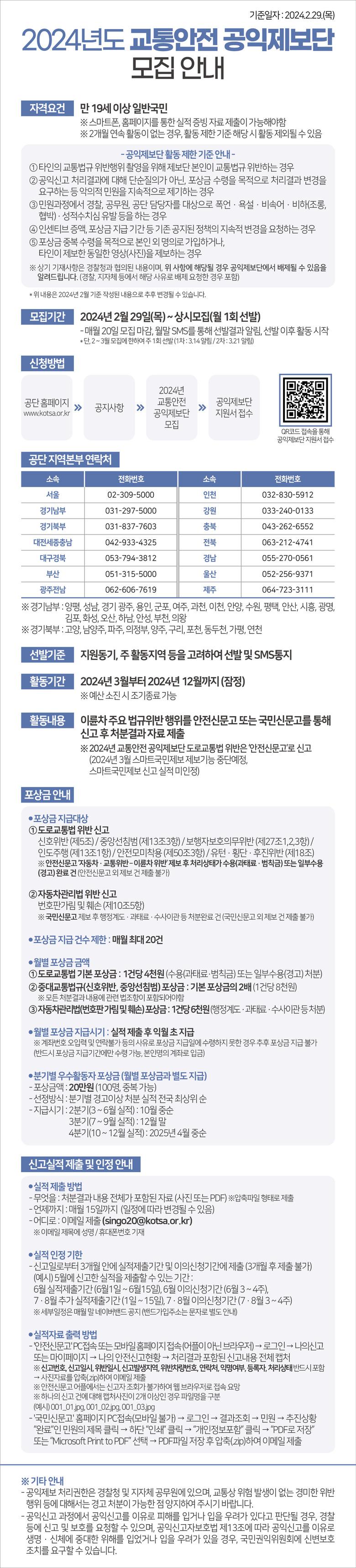 ‘2024년 교통안전 공익제보단’은 2월29일(목)부터 상시 모집중이며(운영인원 초과 시 마감), 공단 홈페이지 및 QR코드를 통해 지원이 가능하다.