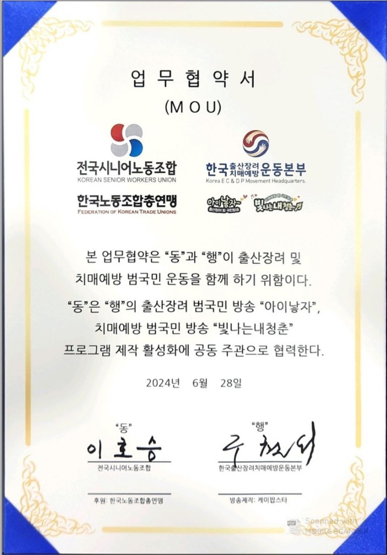 한국노총 산하 전국시니어노동조합(위원장 이호승)과 한국출산장려치매예방운동본부(중앙회장 구천서)가 저출산 및 고령화 사회 문제 해결을 위한 홍보 및 국민 인식 개선 캠페인에 나선다. 두 단체는 2024년 6월 28일 한국노총 6층 회의실에서 출산장려 범국민방송 '아이낳자'와 치매예방 범국민방송 '빛나는 내 청춘'의 제작 활성화를 위한 공동 주관 업무협약을 체결했다.