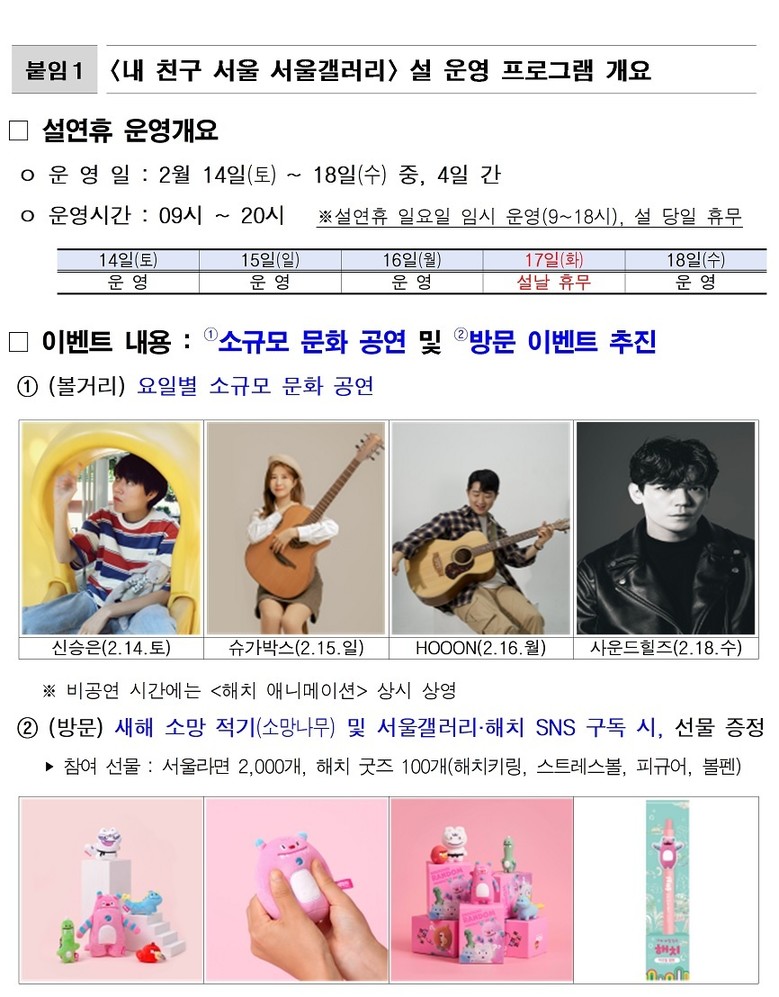 서울갤러리와 해치&소울프렌즈의 SNS를 구독 후, 소망나무에 새해 소망을 적고 방문 후기를 남기면 서울마이소울·해치 굿즈를 증정하는 특별한 이벤트도 진행될 예정이다.