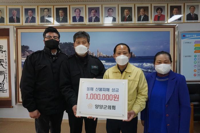 [동해시=세계타임즈 김민석 기자] 양양군의회(의장 김의성)와 당진시의회(의장 최창용)는 11일 강릉 옥계 산불 발생과 관련, 동해시의회(의장 김기하)를 방문해 동해 산불 피해 복구와 이재민 지원을 위해 써달라며 각각 복구지원 성금 100만원 상당 기탁금과 500만원 상당 당진쌀 300포를 전달했다.