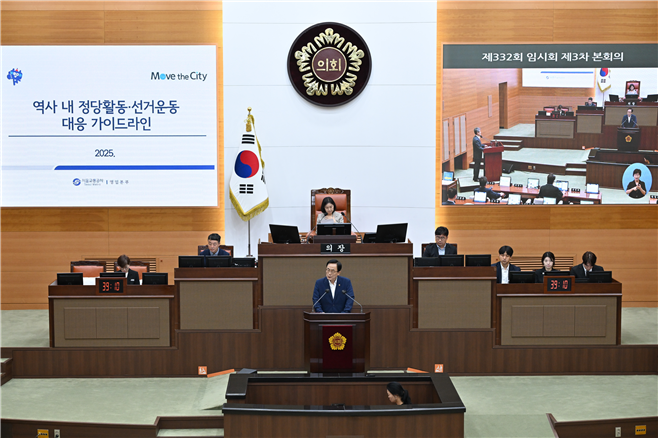[서울 세계타임즈=이장성 기자] 서울특별시의회 김형재 의원(국민의힘·강남2)은 29일 열린 서울시의회 제322회 임시회 본회의 시정질문에서 서울교통공사가 지난 2월 제정한 ‘지하철 역사 내 정당활동 및 선거운동 가이드라인’의 위법성과 부당성을 강하게 지적하며 즉각 폐지를 촉구했다.