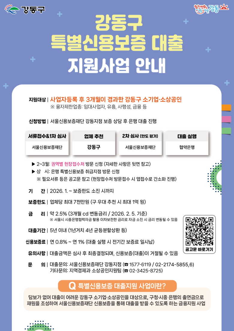강동구에 사업자 등록을 한 지 3개월이 경과한 소기업·소상공인이라면 신청할 수 있으며(제한 업종은 강동구청 누리집 공고문 참고), 보증 한도는 업체당 최대 7천만 원이다. 아울러 구 우대 추천제도를 확대하여 구정·지역사회 기여자, 전통시장·골목형 상점가 상인, 생계형 자영업자는 최대 1억 원까지 금융 심사 후 지원받을 수 있다.